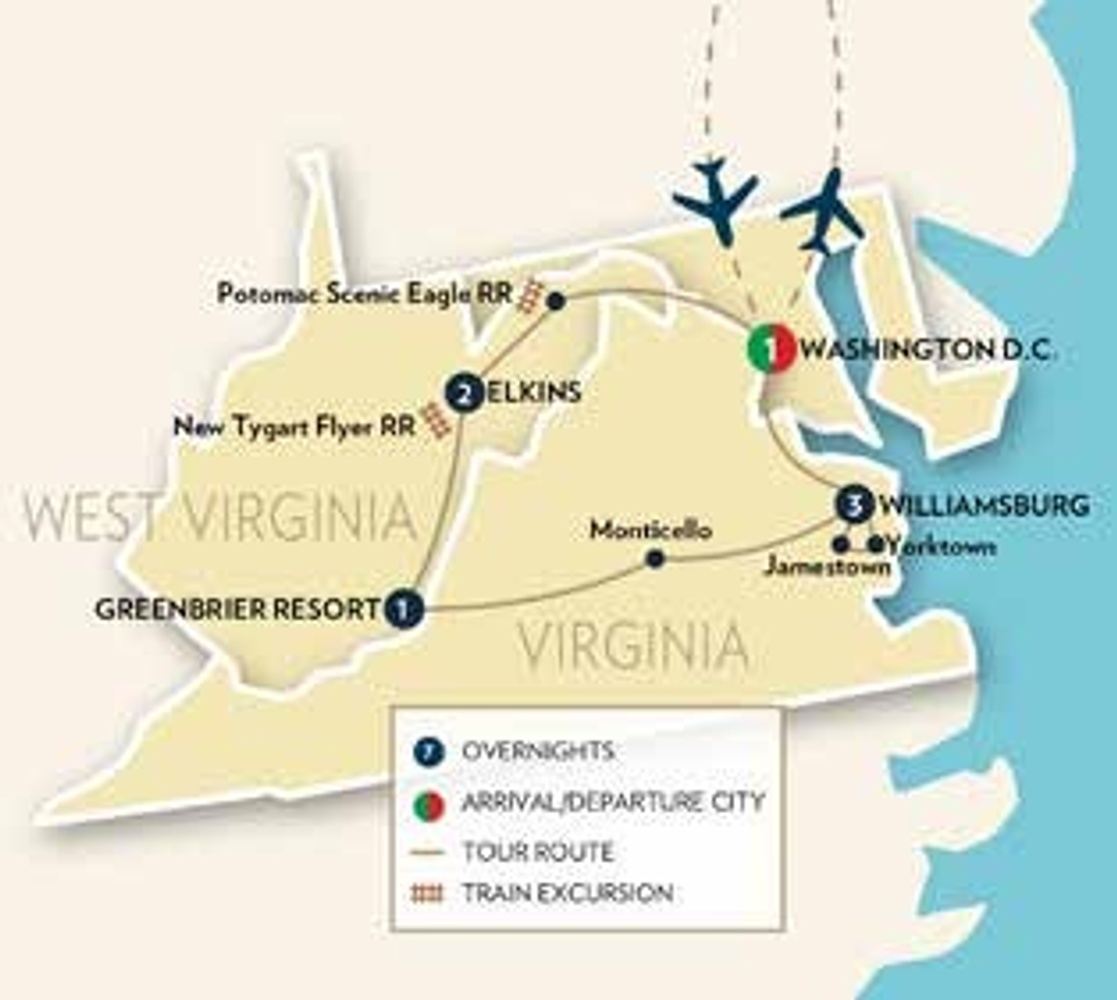 Today travel to the Washington DC area for your return flight home filled with wonderful memories of your West Virginia Rails & Williamsburg Tour. (B)